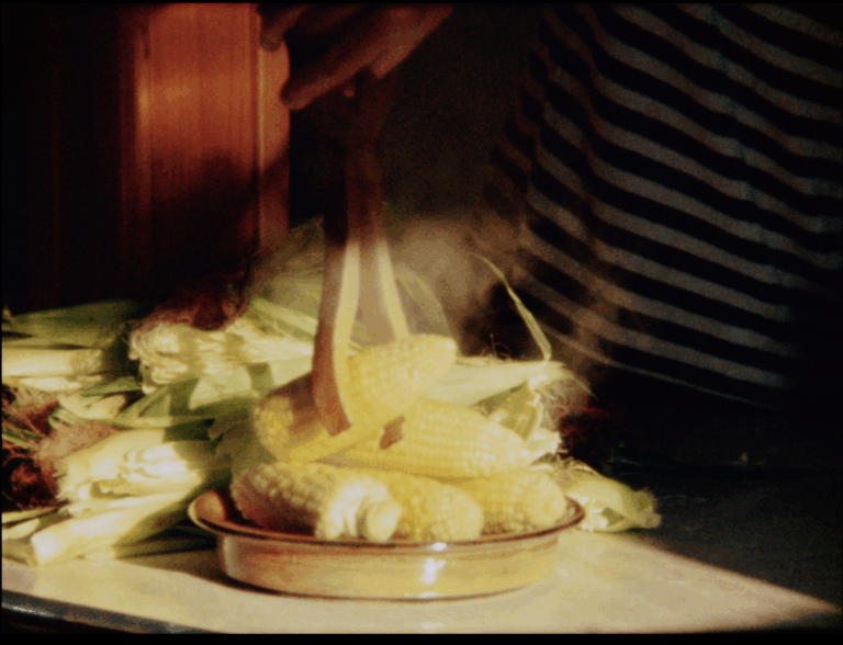This is one of the films that came out of a rejection of expressive camera work, sound, language, editing. I wanted to offer a rich experience of phenomena and associations that could come from a continuous moving image the length of a roll of film. The scene is a space of ceremony, of an offering. This is the world of my house in the country, of my marriage to a potter whose bowl represents her. She is the actor. There are actions that have to do with the transformation of ears of corn into sustenance. These actions take place within a space/time theater of slow continuous changes of light and shadow. There are long spaces where the viewer is free to look at various parts of the screen and, with the steam that rises from the cooked ears, into the very grains of the film itself. The sinuous dance of steam is a counterpart to the fog of Fog Line. The two films are joined. (Larry Gottheim)