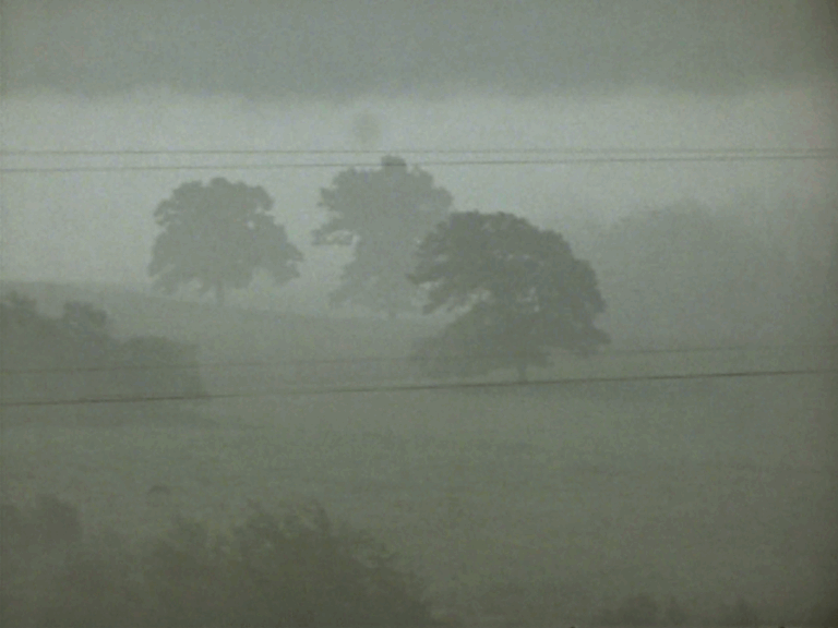 The fog lifts on a scene. For an attentive viewer the mental fog could also lift. It doesn’t go from white to full clarity. It just shows a piece of time, a section of a process in the landscape and in the mind of the viewer. The entire image slowly changes, the sky, the ground, what’s at the edges. The main features are the three trees and the wires. The trees stand there, manifesting their being. They have a soft shape without outline. The lines of the wires are something else. They relate to drawing rather than painting, the controlling mind rather than the imagination. The implications of this contrast go right through my work. There is something ethereal, ghostly. The viewer is invited to explore the screen, looking here and there, each person following a different path. Those whose path includes entering into the very emulsion that makes up the image are rewarded by the sight of ghost horses, the first animals in my films. (Larry Gottheim)