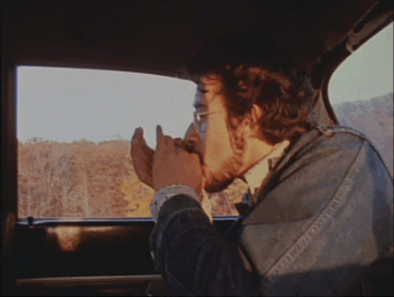 This concludes the series of continuous shot films, but now with sound. The sound is produced by the car and the people inside it. The car window is both a screen and a plane that separates the inner world from the outside. Shelley, the performer, generates the primary sound when he breaks through that plane. The film is popular because of the vibrant energy of the performer, the music and the autumn landscape, but it is also complex. As with the previous films, I myself am passive. The driver and the car and Shelley are the creative forces. He is the first of many avatars, doubles of me, that appear in many of my films and that became one thread of my later attraction to ceremonial possession. (Larry Gottheim)